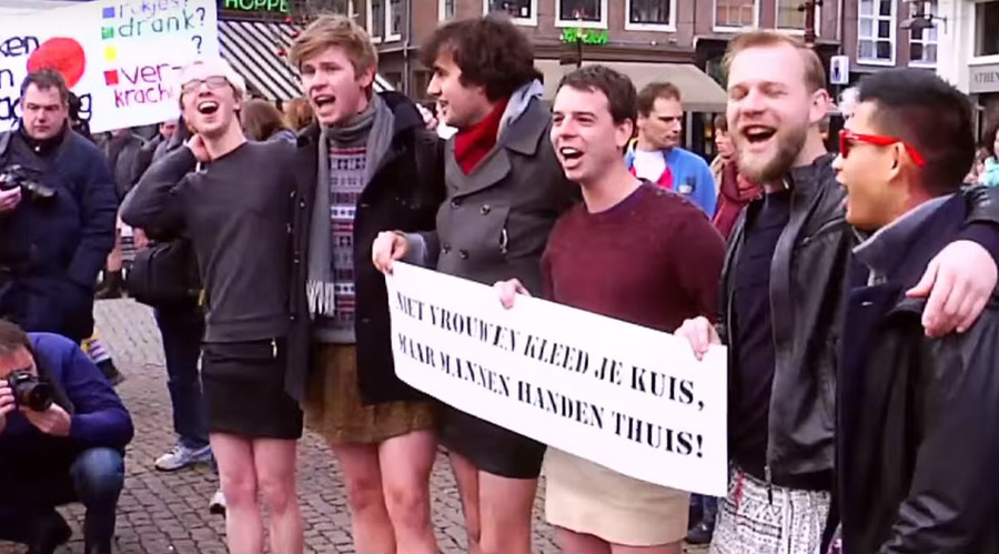 Mannen demonstreren in minirok tegen seksueel geweld tegen vrouwen in de binnenstad van Amsterdam pic.twitter.com/vxpPlvj8yl