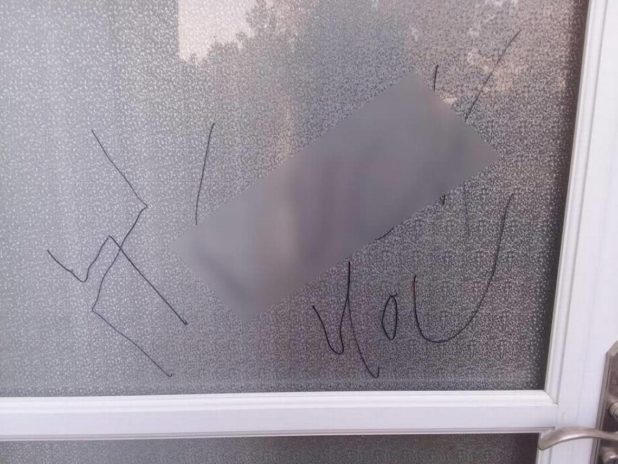 “There’s a slight fear factor, however, it’s more about the anger,” he said. “We feel violated. This person had the audacity to come into our gated backdoor area to write on our door.”