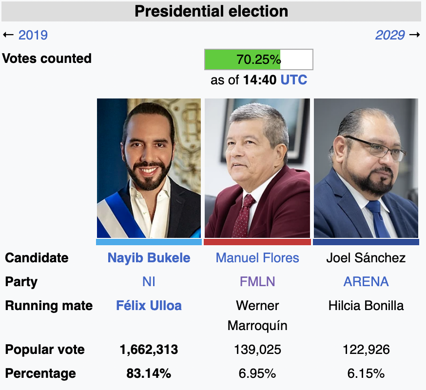 Provisional results on Monday morning showed Bukele winning 83% support with just over 70% of the ballots counted. Bukele declared himself the winner before official results were announced, claiming to have attained more than 85% of the vote.
