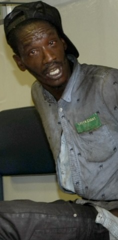 The suspect, who was sweating and disheveled and wore a baseball cap, was taken away in cuffs.