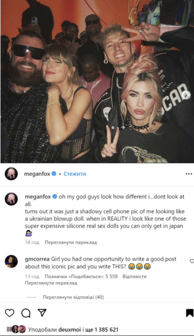 Fox posted a photo of herself and fiance Machine Gun Kelly along with pop starTaylor Swift and Super Bowl winner Travis Kelce to Instagram on Wednesday. In the accompanying caption, Fox joked that the “shadowy cell phone pic” made her look “like a Ukrainian blowup doll. when in REALITY i look like one of those super expensive silicone real sex dolls you can only get in Japan.”