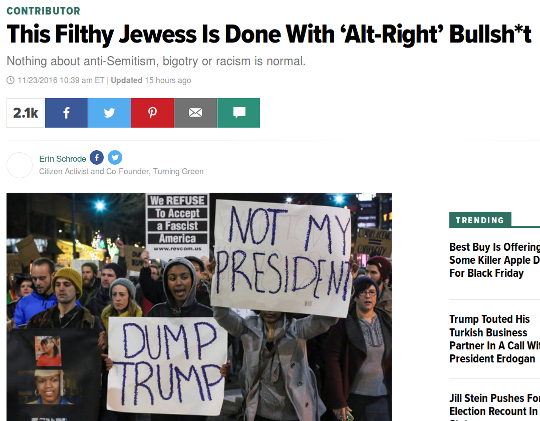 “The ugly kike Erin Schrode from Marin County hilariously got shot by a rubber bullet as she was making trouble on the behalf of the low-IQ redskins in North Dakota.”