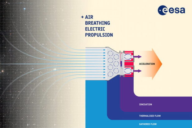 Satellites in orbit traditionally use an onboard propellant — usually xenon — to adjust their orientation and keep their orbit from decaying. Their life is limited by how much propellant they can carry, however. The new “air breathing” design skims molecules from the upper atmosphere and converts them into useable fuel.