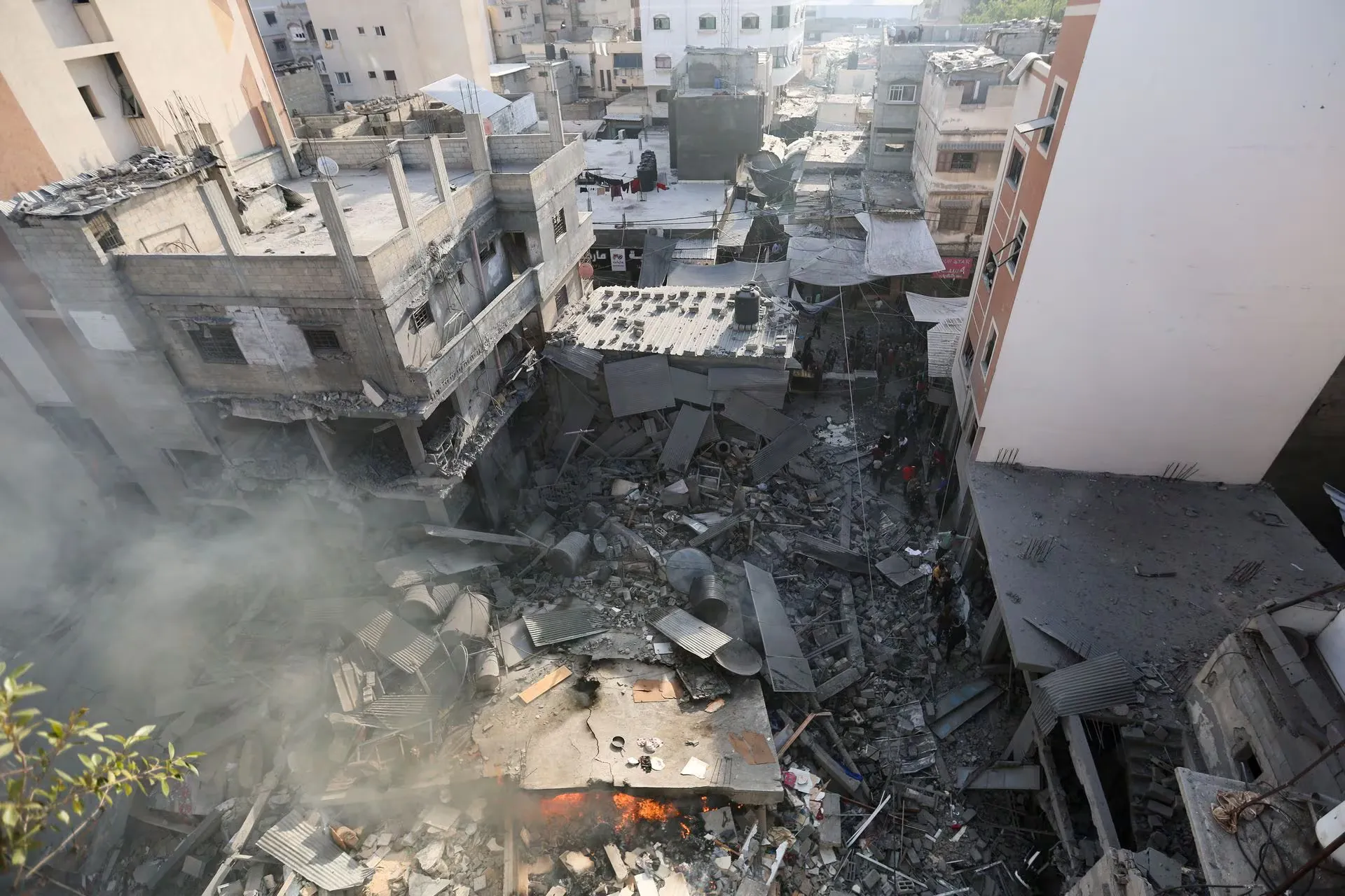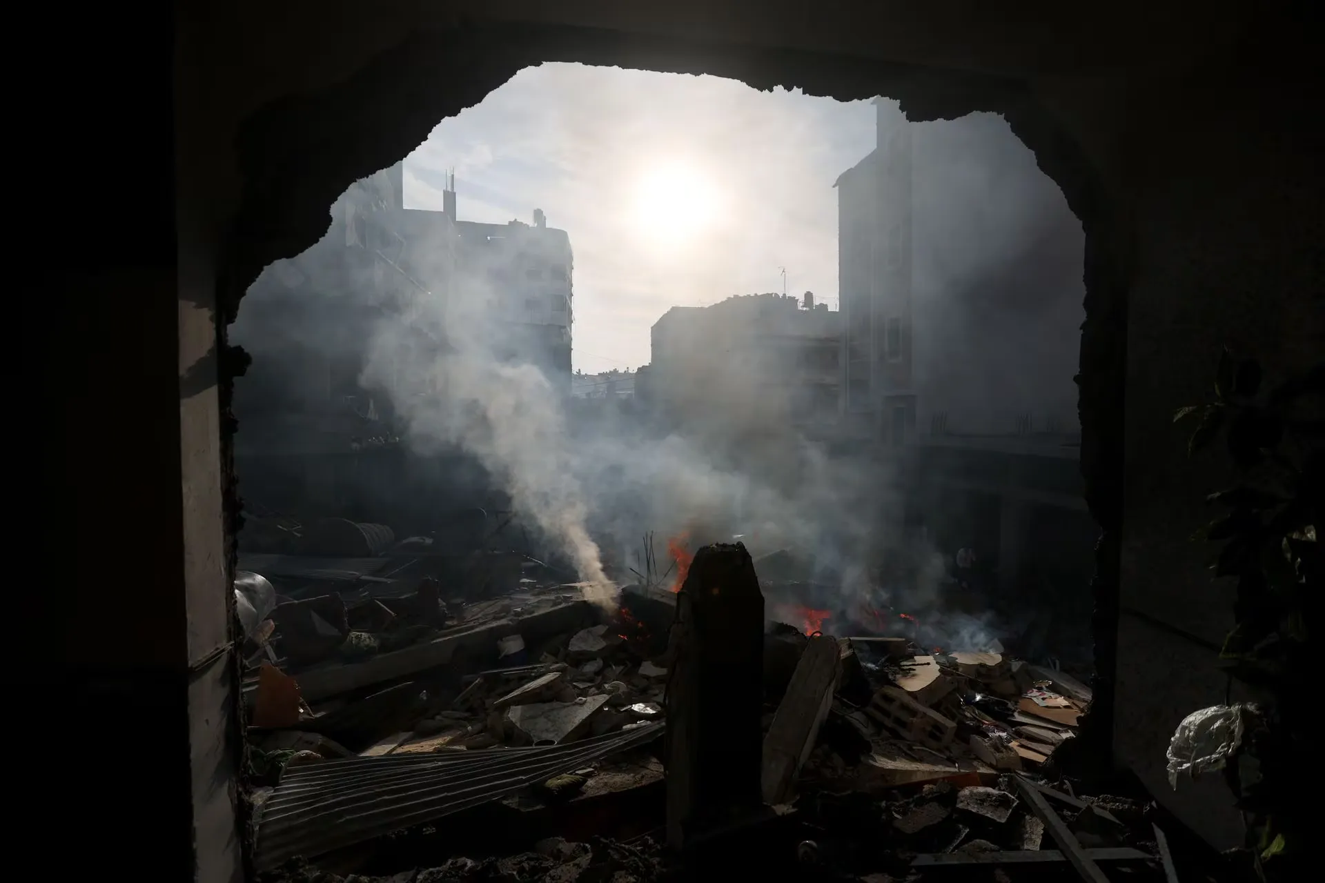 At a home in Khan Younis that was struck overnight, flames licked the collapsed masonry and grey smoke billowed out from the rubble. A child’s stuffed toy of a sheep lay in a pile of dust. Boys were picking through the wreckage. Next door, Nesrine Abdelmoty stood amid damaged furniture in the rented room where she lives with her divorced daughter and two-year-old baby.