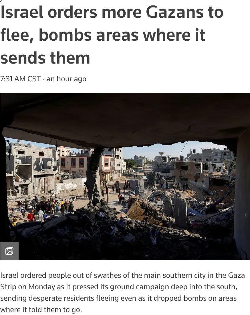 Israel ordered people out of swathes of the main southern city in the Gaza Strip on Monday as it pressed its ground campaign deep into the south, sending desperate residents fleeing even as it dropped bombs on areas where it told them to go.
