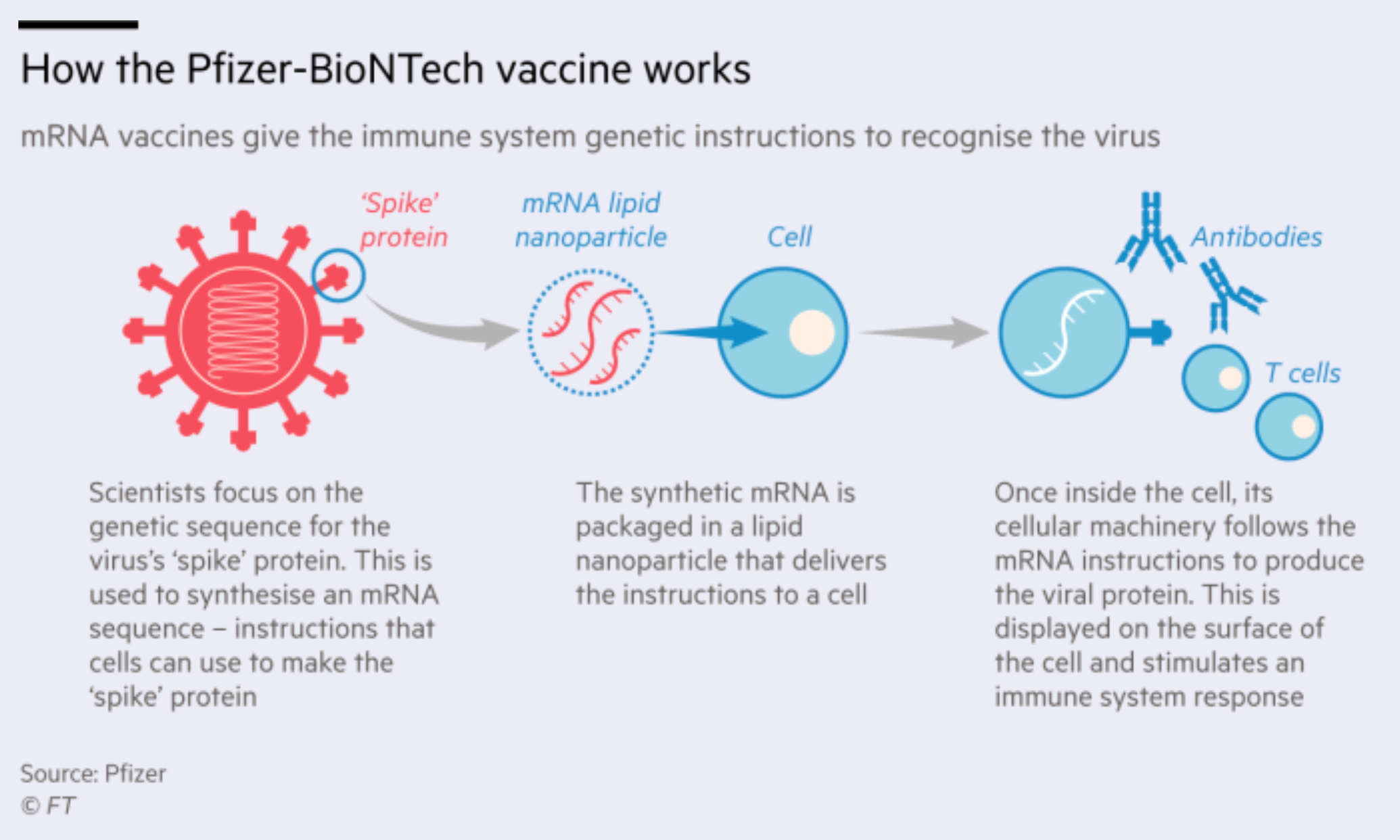 To produce an mRNA vaccine, scientists produce a synthetic version of the mRNA that a virus uses to build its infectious proteins. This mRNA is delivered into the human body, whose cells read it as instructions to build that viral protein, and therefore create some of the virus’s molecules themselves. These proteins are solitary, so they do not assemble to form a virus. The immune system then detects these viral proteins and starts to produce a defensive response to them.