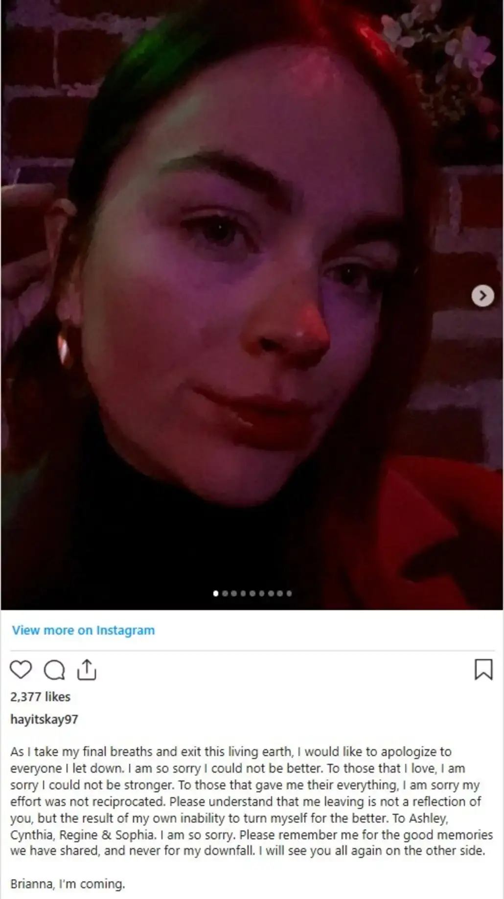 “As I take my final breaths and exit this living earth, I would like to apologize to everyone I let down. I am so sorry I could not be better,” reads the emotional Instagram post. “To those that I love, I am sorry I could not be stronger. To those that gave me their everything, I am sorry my effort was not reciprocated.”