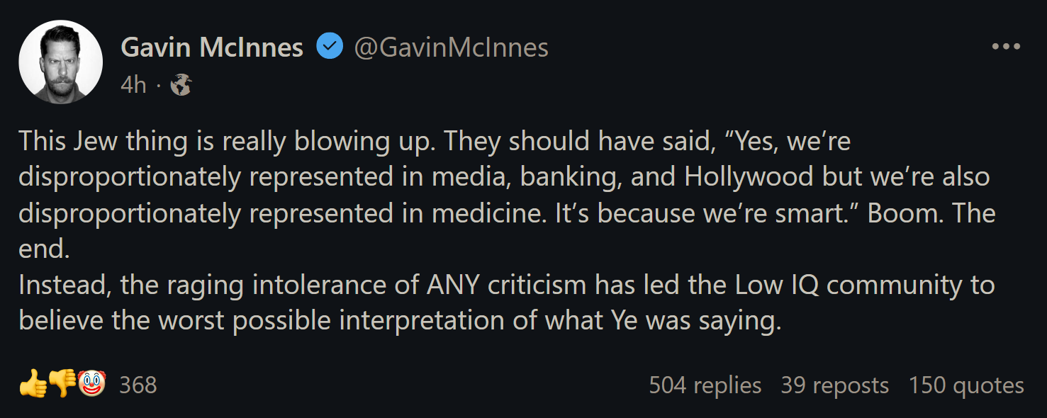 All these people defending the Jews are going to hell. Gavin McInness is going to the lowest pit for race traitors, and so are all these blacks who are selling out their own race to the Jews.