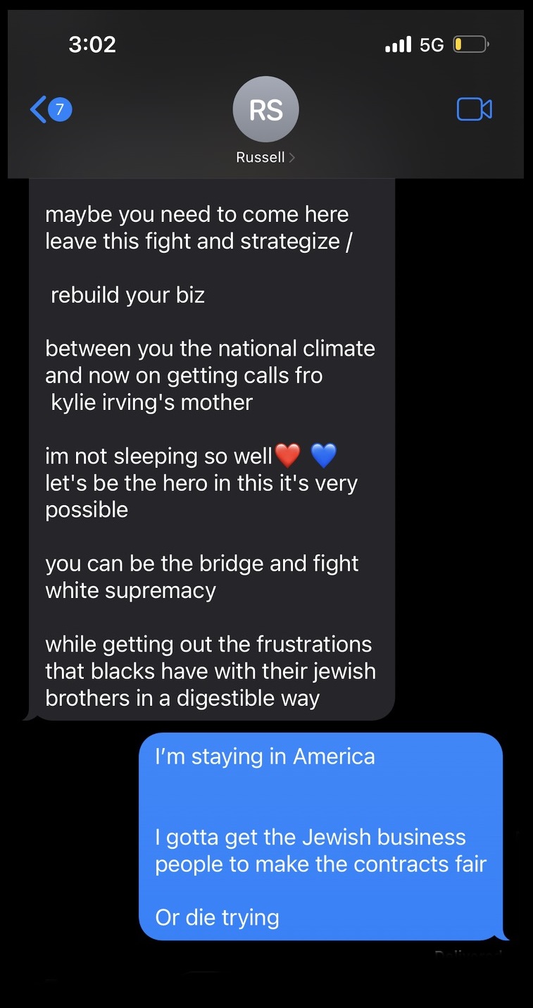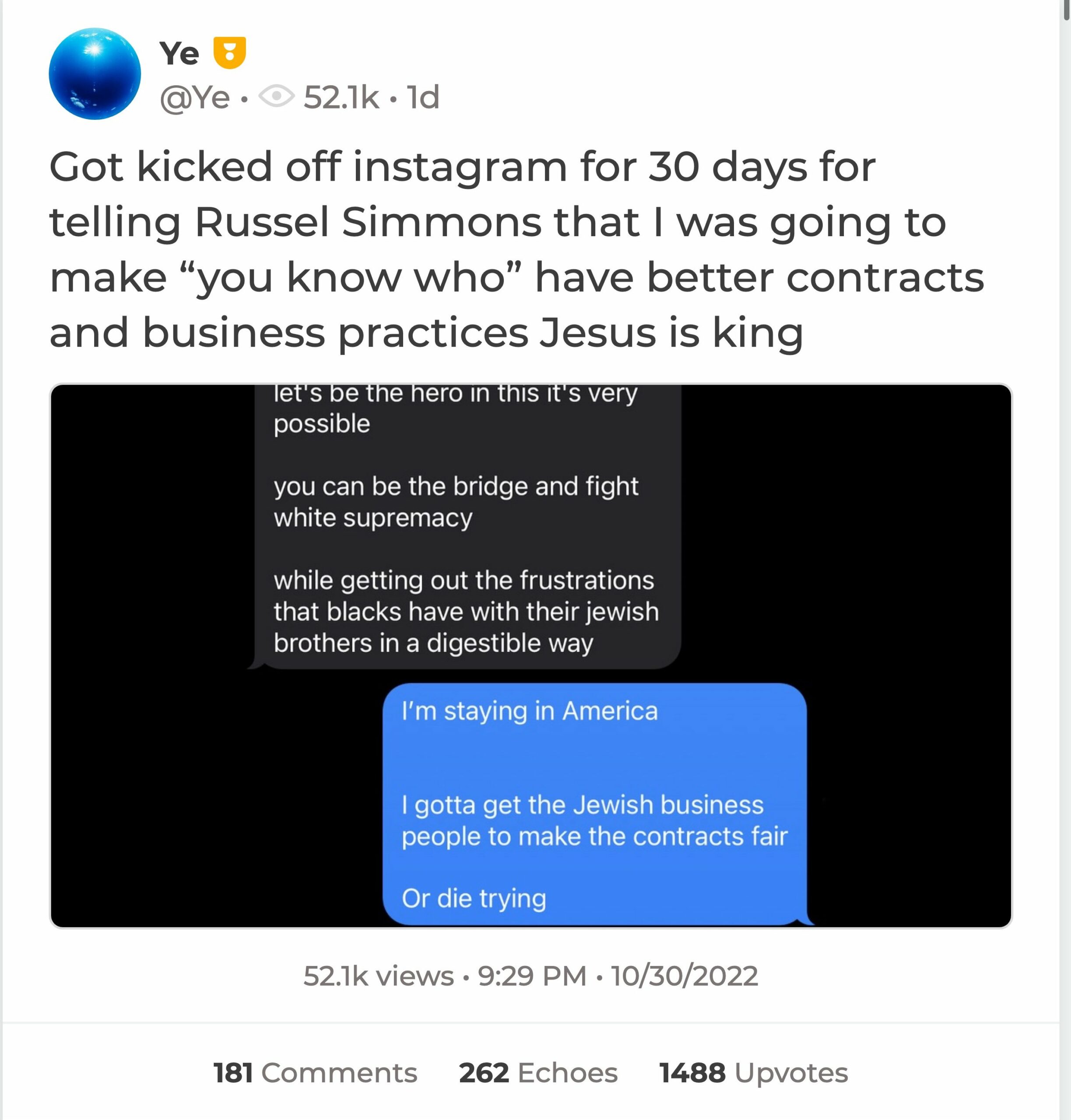 It’s not clear why Ye was allowed back on Instagram in the first place, but he posted texts from Russell Simmons, who is a lightskin and a bitch, and he got banned again.