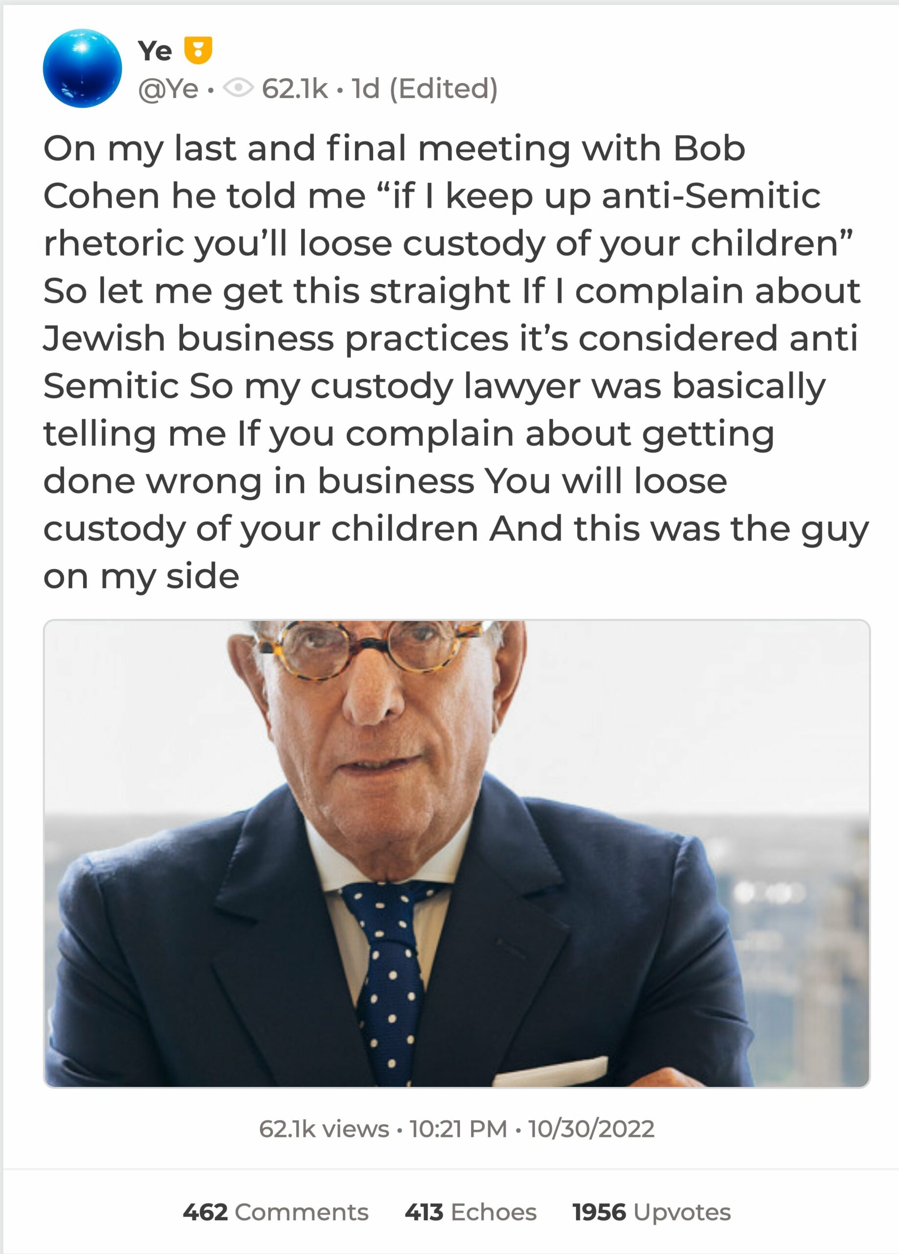 Ye’s own Jew lawyer is now threatening to take his kids away from him. Ye revealed in a post on Parler over the weekend that Bob Cohen, his Jew lawyer, said he is going to lose custody of his kids if he doesn’t stop talking about the Jews.