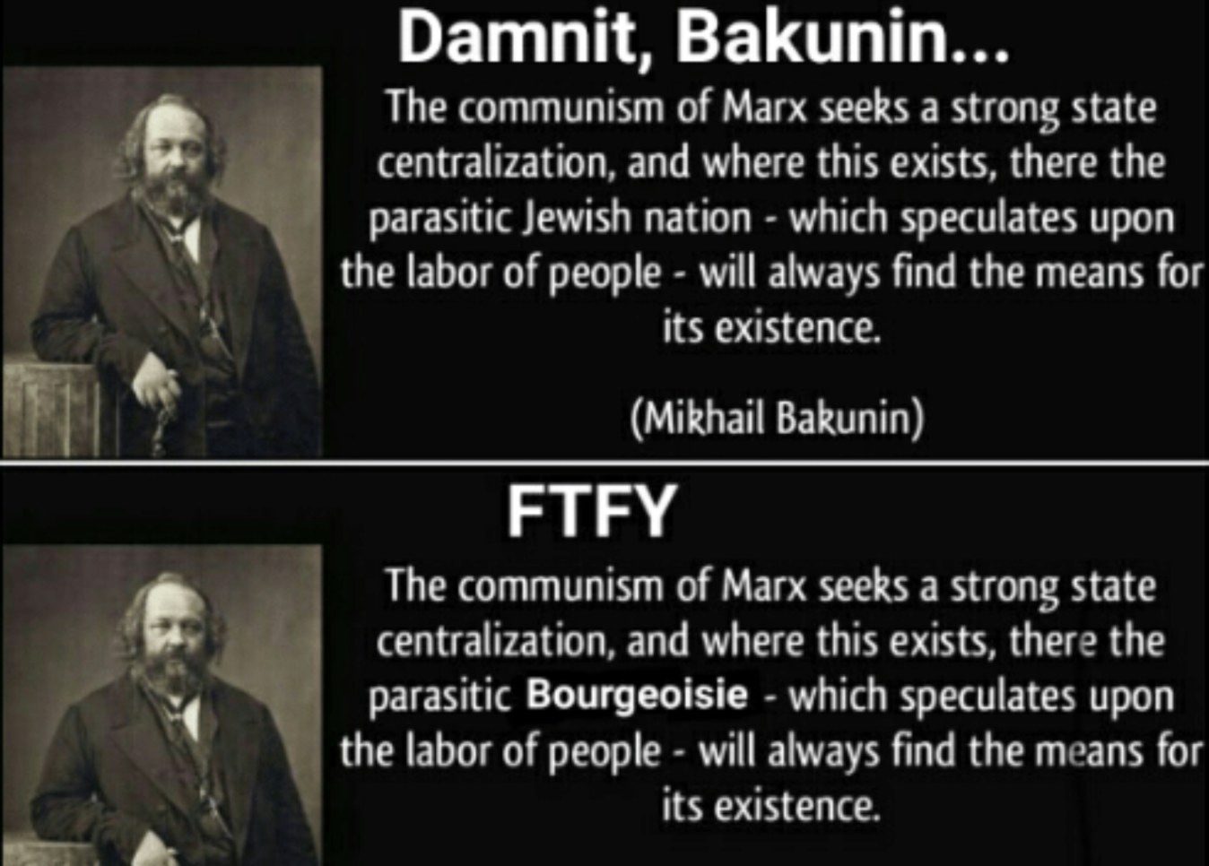 Meanwhile, Mikhail Bakunin, probably the most notable anarchist in history, wrote that Marx was planning a Jewish conspiracy. Up until recently, Bakunin was widely read and cited by “Antifa” types, but he’s been removed from the canon due to his anti-Semitism.