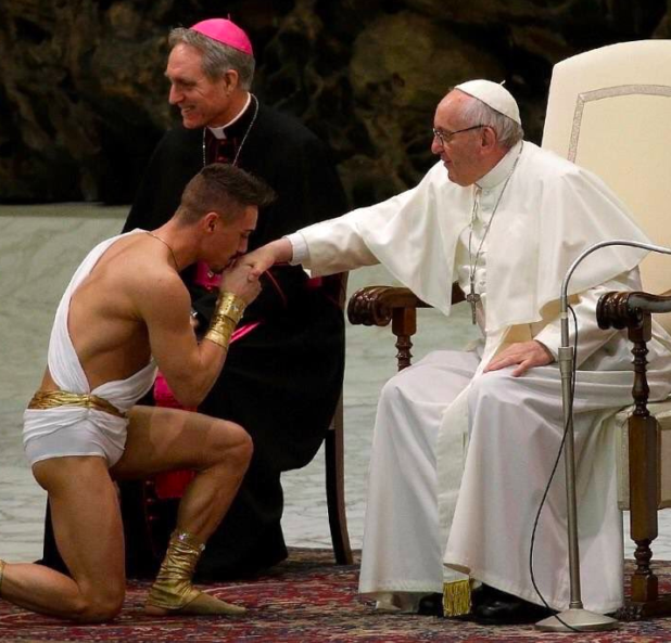 Proof in point, the Pope didn’t have a problem with letting a costumed fag kissing his ring, did he?