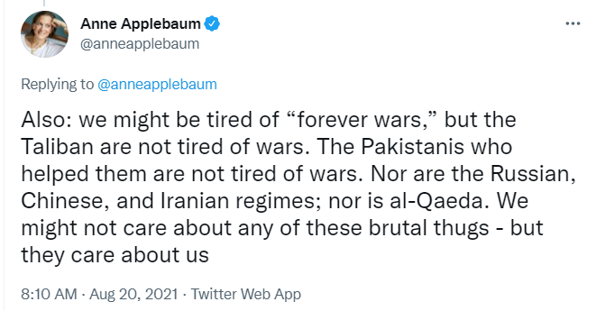 We don’t need to do wars “forever,” we simply need to do them until the Taliban, Russia, and China accept that democracy values are universal values, and that any other system of government is morally reprehensible.