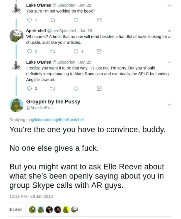 But you notice that even after he was exposed as a liar and exposed for threatening people – not to mention openly writing about looking through my mother’s window as he hid outside her house – Luke continued to work at The Atlantic and Huffington Post. These people do not care about the truth, and what Luke said about how he can just openly lie about things relating to “Nazis” and the editorial staff won’t care is I believe true.