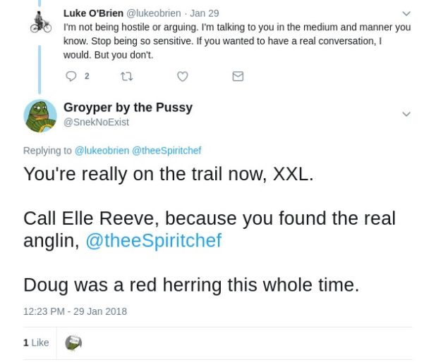 He then got defensive, trying to explain to these groypers how he wasn’t hurt by the suggestion of Elle Reeve seeing him engaged, as a man in his fifties who claims to be a journalist, in a name-calling contest with anonymous teenagers.