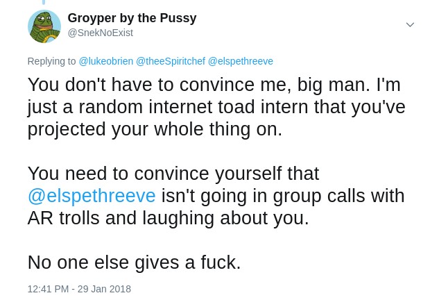 This comes after the Twitter groypers claimed that there was a Skype chat with her and a bunch of Alt-Right guys where she mocked him and laughed at him.
