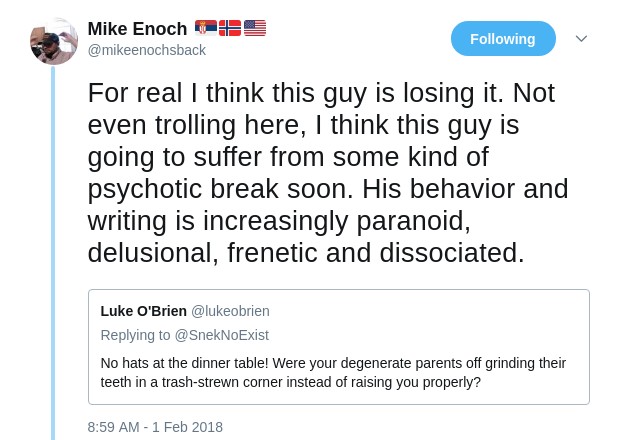 I don’t know if he’s using some type of drugs, or if trying to beat me in some kind of chess game that he doesn’t even know the rules of his just driven him over the edge, but this guy is not well, and I think the people around him need to be careful.