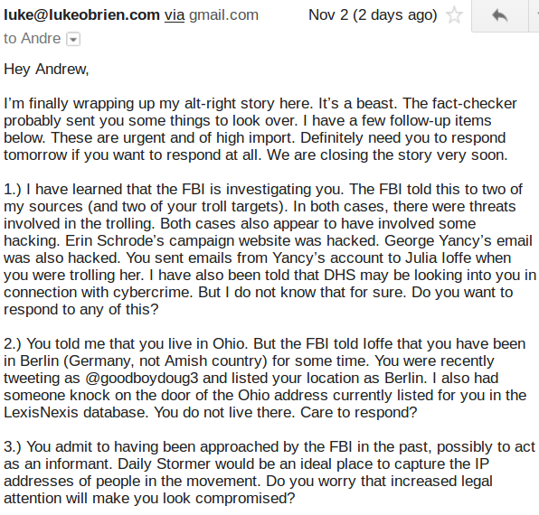 My old friend then said he didn’t want his name associated with the Alt-Right in a paper, and then he tried to extort him, saying if he didn’t talk he would be defamed.