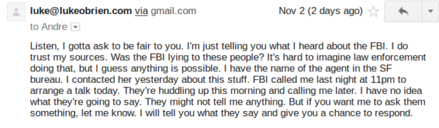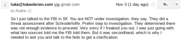 Then he tried to hoax me with fake FBI communications, claiming he just called up the FBI and they gave him a bunch of information on ongoing investigations against me.