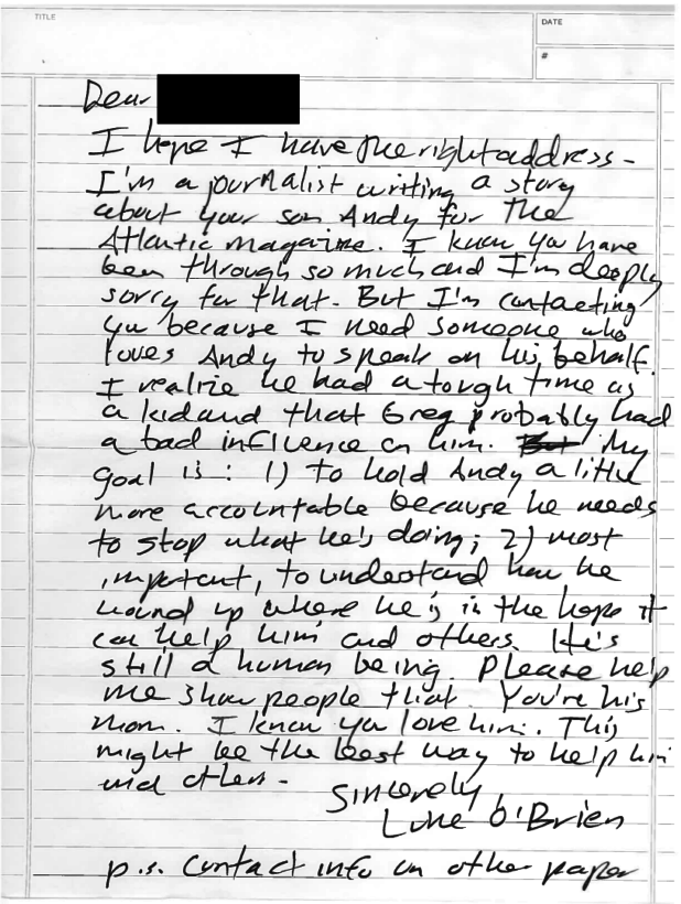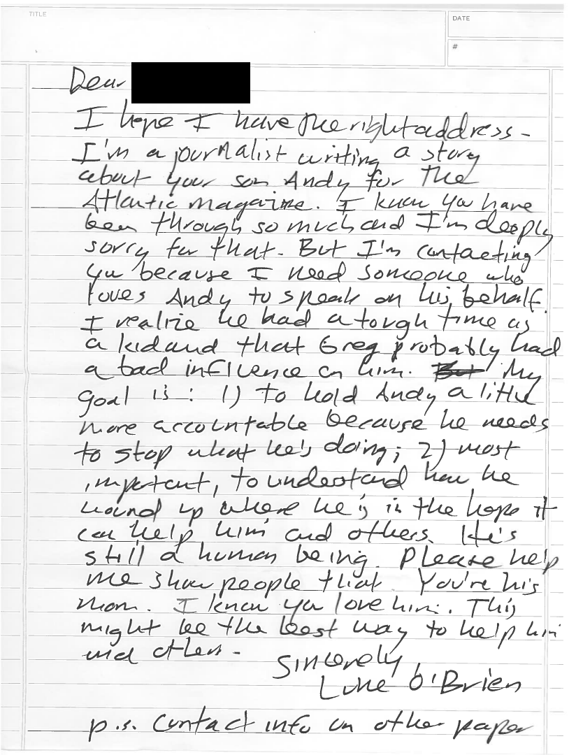 I hope I have the right address – I’m a journalist writing a story about your son Andy for the Atlantic magazine. I know you have been through so much and I’m deeply sorry for that. But I’m contacting you because I need someone who loves Andy to speak on his behalf. I realize he had a tough time as a kid and that Greg probably had a bad influence on him. My goal is: 1) to hold Andy a little more accountable because he needs to stop what he’s doing; 2) most important, to understand how he would up where he is, in the hope it can help him and others. He’s still a human being. Please help me show people that. You’re his mom. I know ya love him. This might be the best way to help him and others.
