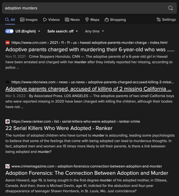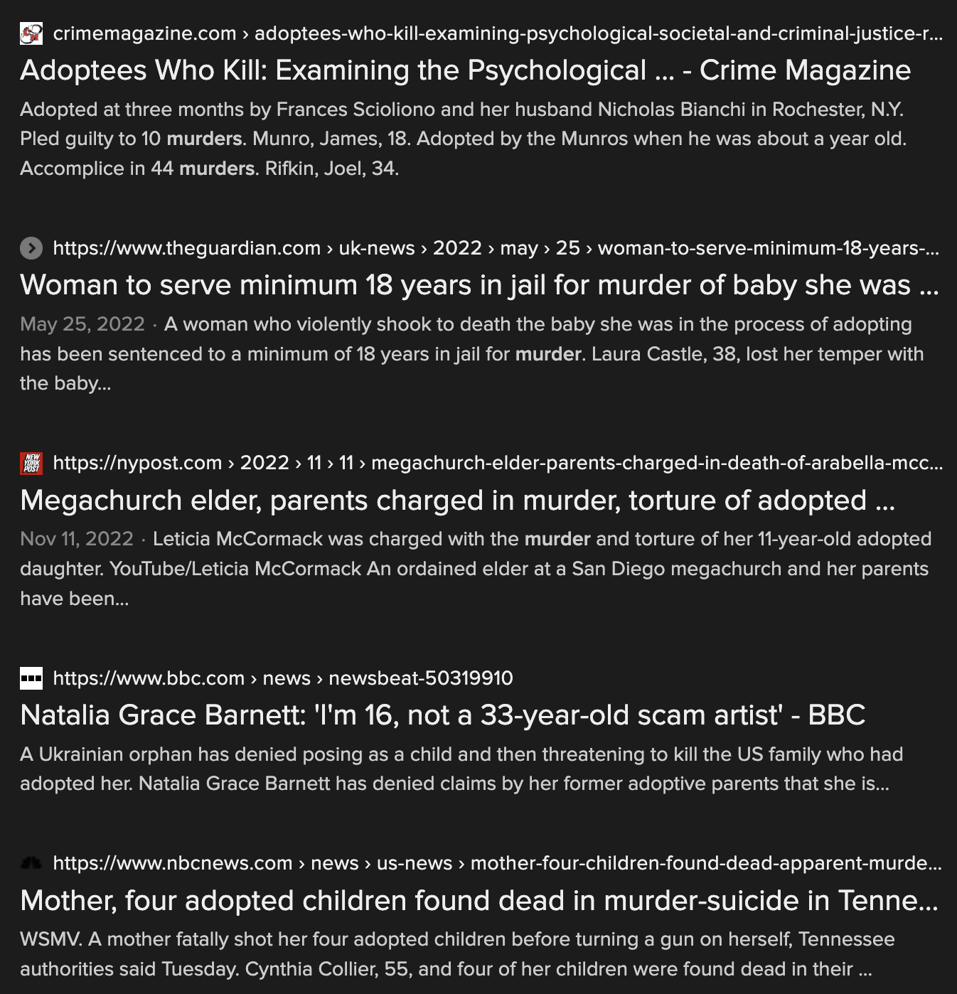 The murder cases are the most extreme, but all stranger adoption ends in tragedy of some sort. No one ever comes out of these situations happy. The children almost always end up completely alienated from their fake parents after they move out of the home, and the fake parents regularly refuse to support them financially or otherwise.