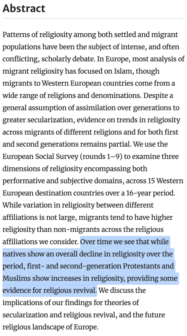 Studies are very clear that these people do not secularize on a long term scale, let alone become Christian. There are dozens of very serious studies on the fact that the longer Moslems are in Europe, the more aggressively religious they become. Here’s an abstract from a study published in the European Journal of Population that cuts to the core: