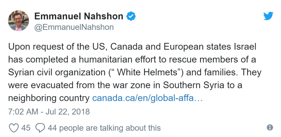 Emmanuel Nahshon, a Foreign Ministry spokesman, had confirmed on Twitter that “Israel has completed a humanitarian effort to rescue members of a Syrian civil organization (“the White Helmets”) and [their] families.” He chose not to disclose further details, adding only that the evacuees have been brought “to a neighboring country.”