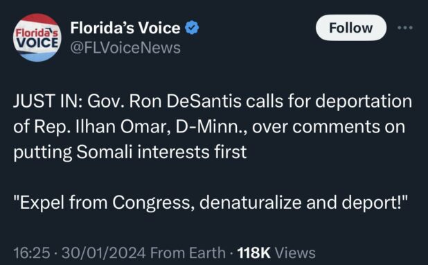 DeSantis also recently called for Ilhan Omar to be deported, which is a more aggressive and Trump-like statement than what we’ve been hearing from this guy recently.