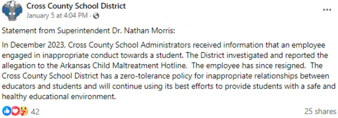 In a statement issued by Nathan Morris, the Cross County Superintendent of Schools said: “The Cross County School District has a zero-tolerance policy for inappropriate relationships between educators and students and will continue using its best efforts to provide students with a safe and healthy educational environment.”