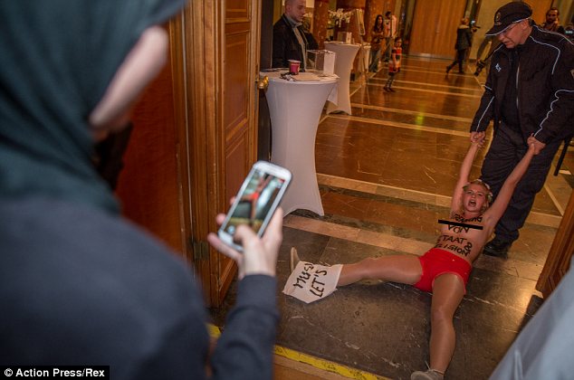 The Berlin Islam Week event, held in one of the city’s town halls, was stopped in its tracks by members of extreme protest group Femen, who charged into the hall with slogans attacking ‘religious oppression’ and Sharia law daubed on their bodies.