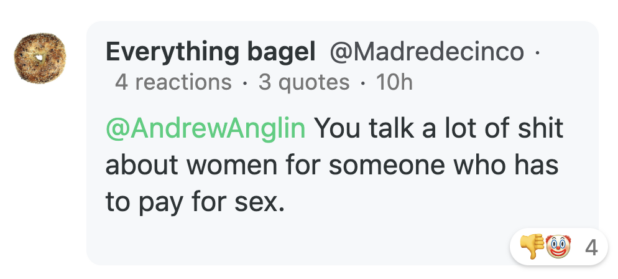 To be clear: I have been open about the fact that I’ve visited prostitutes at various points in my life. This is shameful insofar as any sex outside of marriage is shameful, but my assertion is that it is much less shameful than going around trying to “get laid for free.” It is extremely telling that this is used as an insult. It explains everything about male feminism – the fact that they think this is an insult, that they assume that everyone else will view it as an insult. Because they never overcame childhood trauma, they live in a reality where existence is based on female approval, and they are unable to comprehend a reality in which men do not care about female approval. When I stand up against women, I become the ultimate enemy. Neo-Nazis speak worse about me than the Jews do. These people are seething.