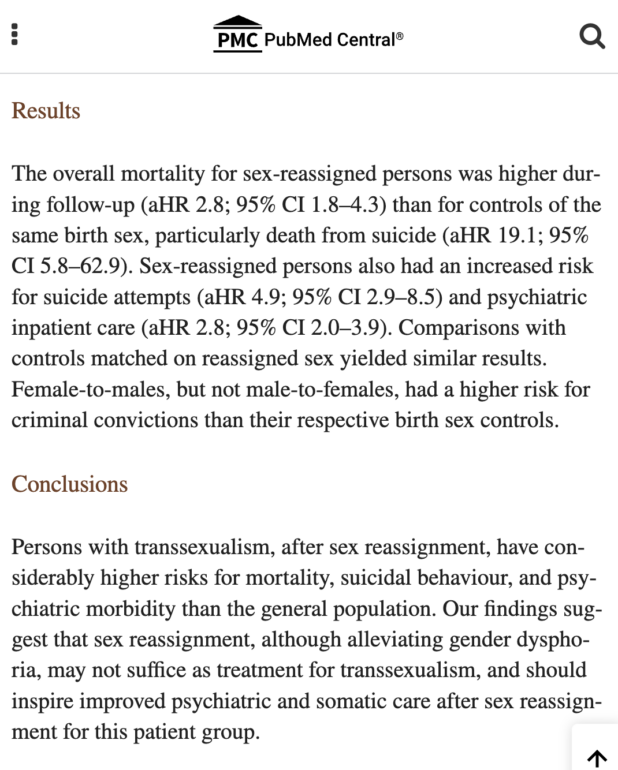 And two, that this group’s higher suicide rate was tied to the fact that they had a higher rate of severe psychiatric problems, not to their gender distress.