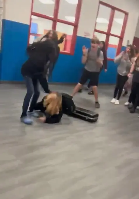 As a crowd of classmates cheered her on, the attacker was filmed taking off her backpack and repeatedly striking the girl in the head and upper body as she covered on the floor.