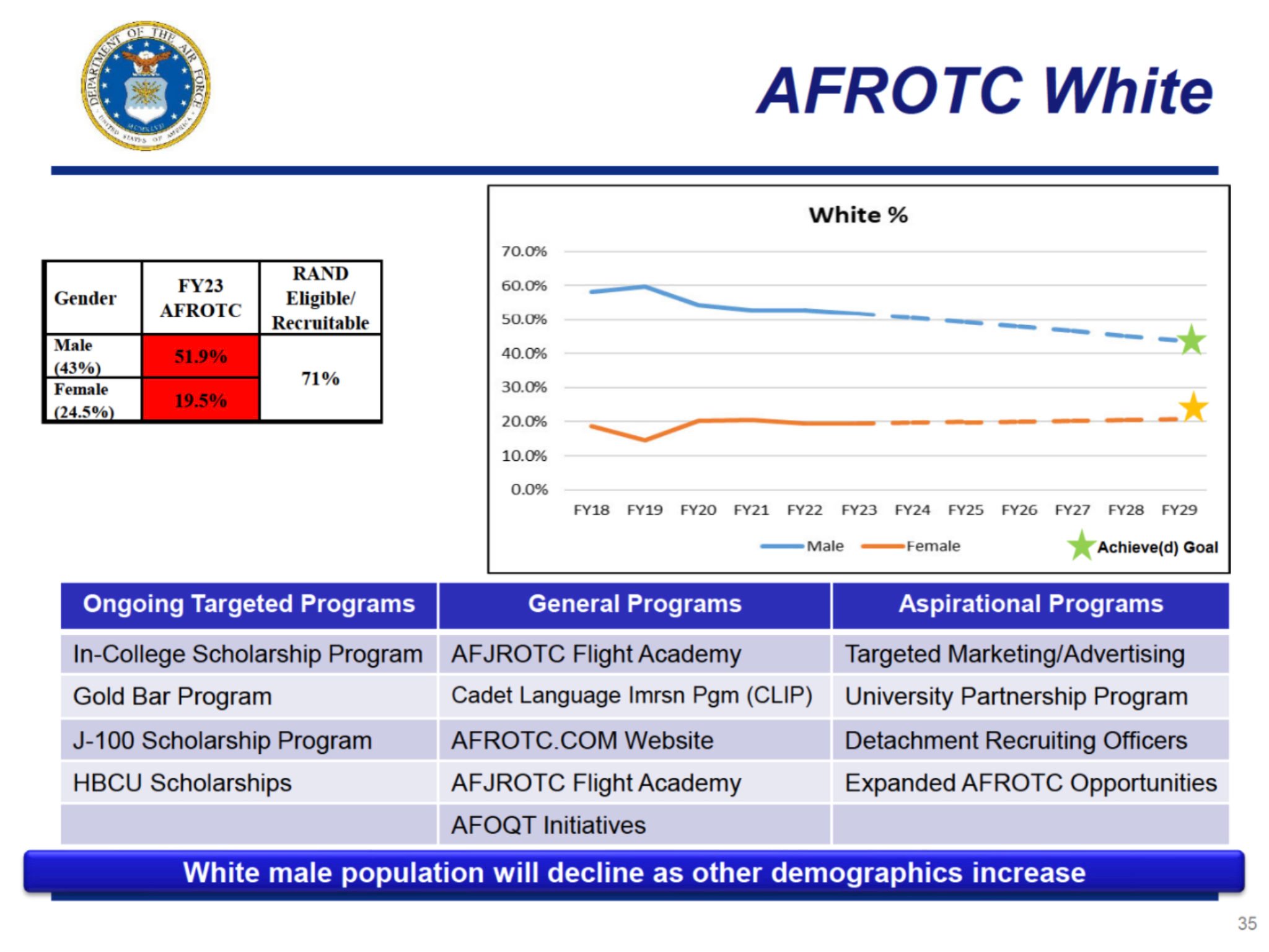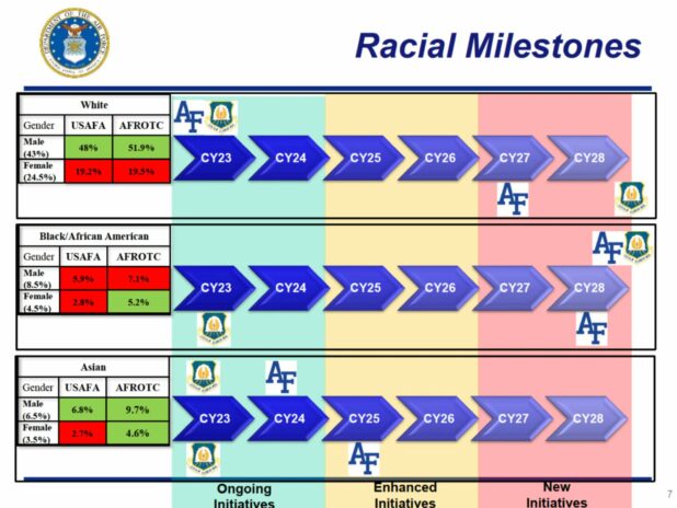 At the bottom of the slide of demographic goals, it states, “White male population will decline as other demographics increase.” The slide in question shows that the Air Force is on track and needs to do more to hit its goal of having only 43 percent of white applicants in the officer program by 2029.