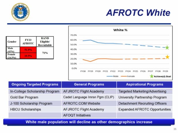 One of the documents, part of a slide show that was obtained, was labeled, “AFROTC White.” It shows a graph of the percentage of white male applicants declining as other demographics are rising in percentage. This percentage declines from 60 percent of the applicants in 2019 to a projected 50 percent in 2023 and that then reaches 43 percent by the projected year of 2029. The percentage is noted as the “goal” by the slides.