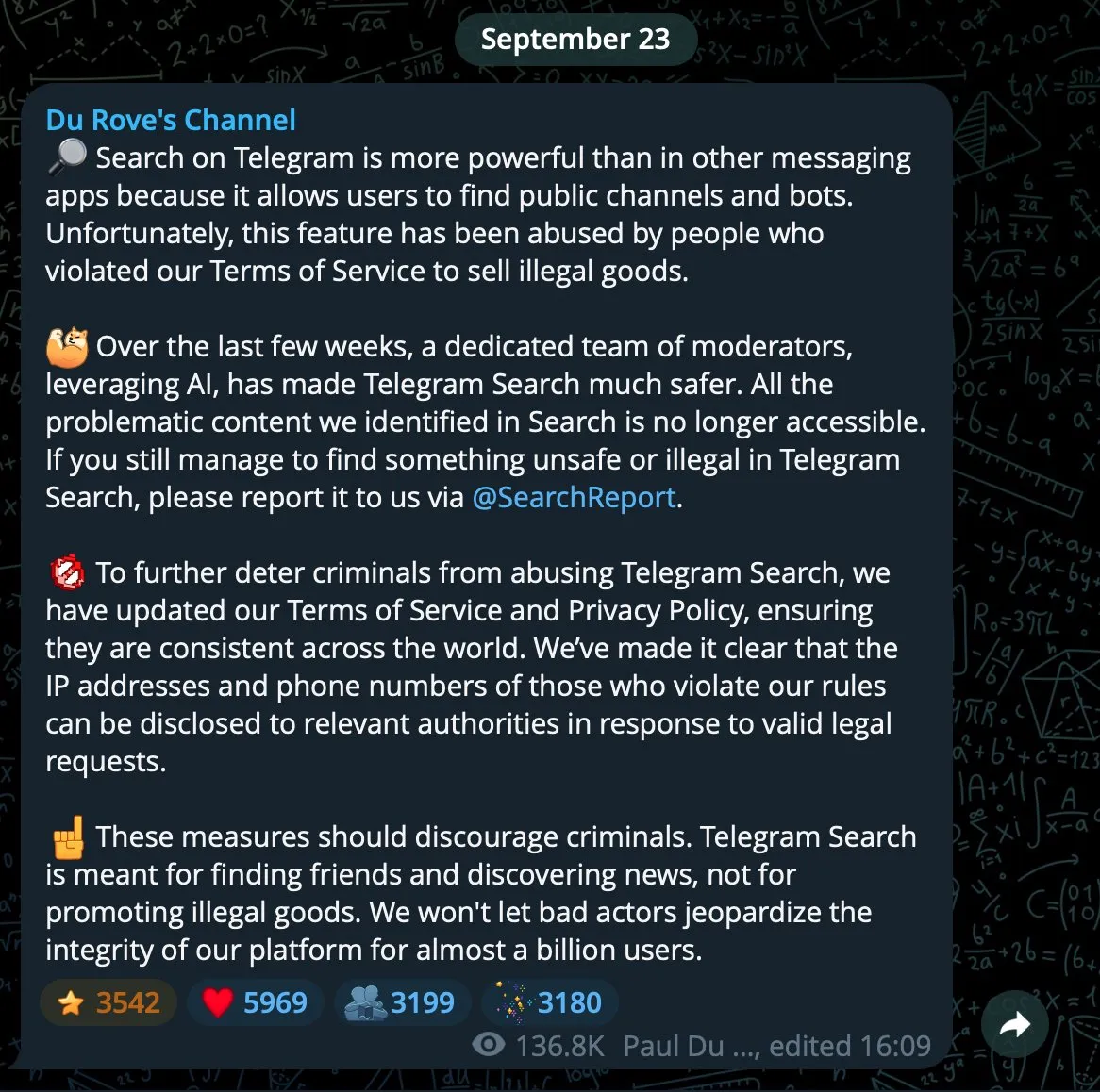 Telegram’s search feature “has been abused by people who violated our terms of service to sell illegal goods”, Durov told the 13 million subscribers of his personal messaging channel.