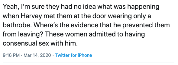 Once again: I have never defended Harvey Weinstein. What I have said is that this is a rape hoax which will have long-running implications for the entirety of society. I think Harvey Weinstein should have been sentenced to prison for all those movies he made (Good Will Hunting in particular), not because of a feminist hoax. I have been 100% consistent on that point ever since the rape hoax charges were brought against him.