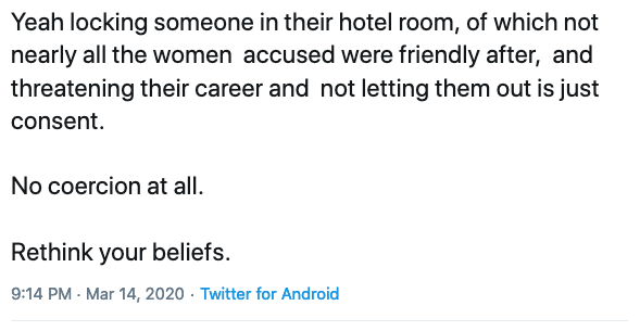 I didn’t get these arguments from his defense team. I’ve been arguing these same points the whole time I’ve had this site. I’ve argued it in every single similar case. And I made these points before the Weinstein defense was ever presented.