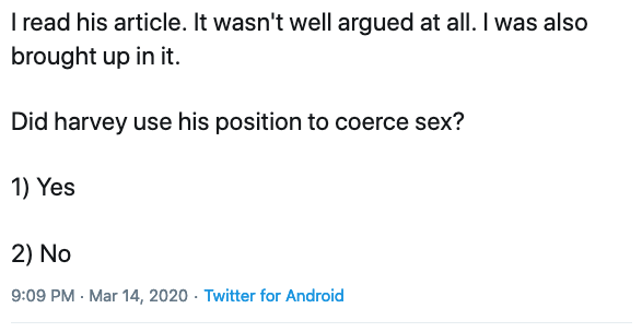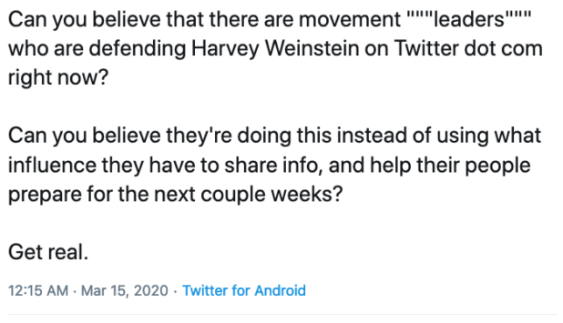 - This take is literally coming out of Weinstein’s PR agency; you didn’t come up with it on your own