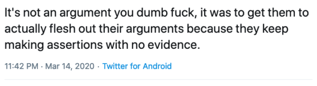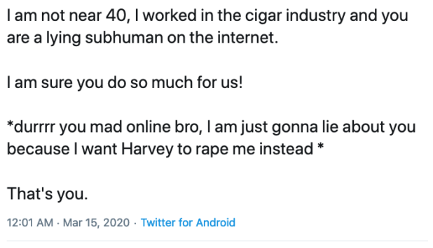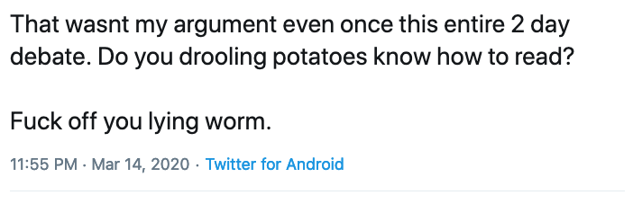 “Please stop pointing out that I’m defending the most filthy whores on earth – instead let’s talk more about Coronavirus!”