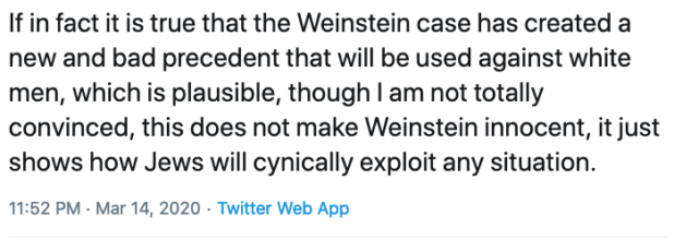That is the agenda here, it is the effect of the Weinstein conviction. This is an attack on our ability to reproduce. And the idea that neo-Nazis care more about one Jew going to prison, or the honor of the alabaster skinned princesses who had sex with Weinstein, than the real world effects that this is going to have on our entire race, is frankly disgusting.