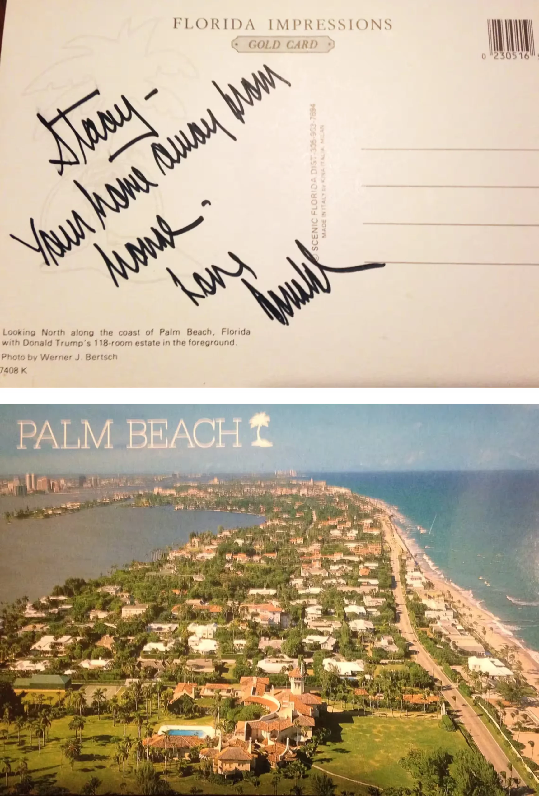 Williams says that Trump sent her agent a postcard via courier later in 1993, an aerial view of Mar-a-Lago, his Palm Beach residence and resort. She shared it with the Guardian. In his handwriting – using what appears to be his usual black Sharpie – he wrote: “Stacey – Your home away from home. Love Donald”.