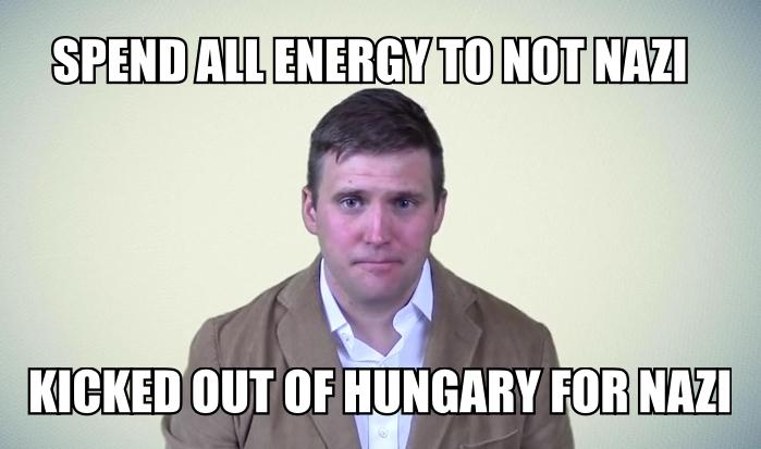 It is slightly profound that this dramarama with the ongoing attacks on The Daily Stormer by these people who agree with all of our goals but find us annoying (slash retarded secret agents) is coinciding with the Budapest dramafest wherein Richard Spencer, a pillar of the “take it easy, bro, it’s cool” White movement was banned from Hungary and arrested for being an evil racist.