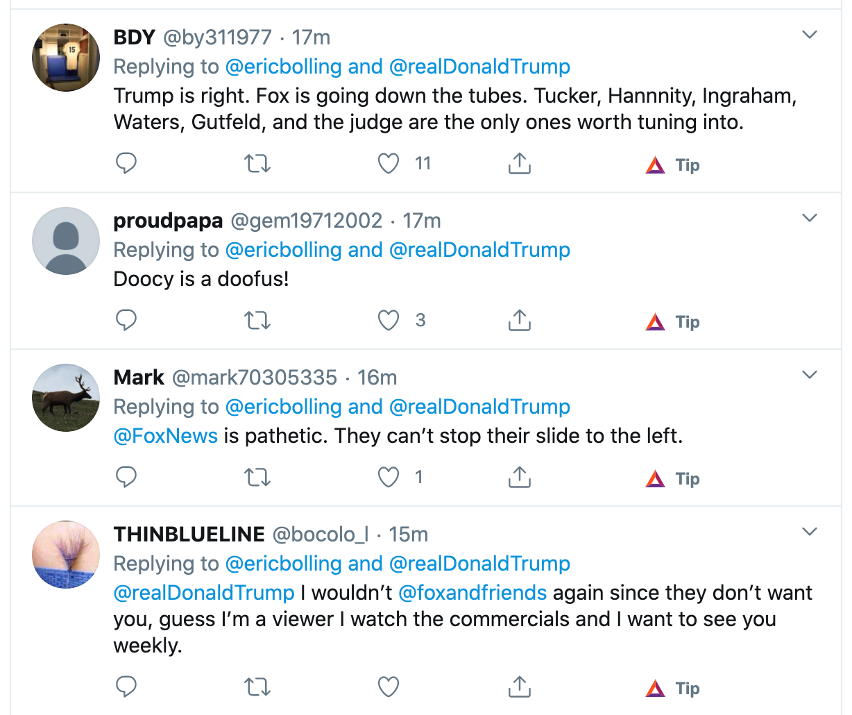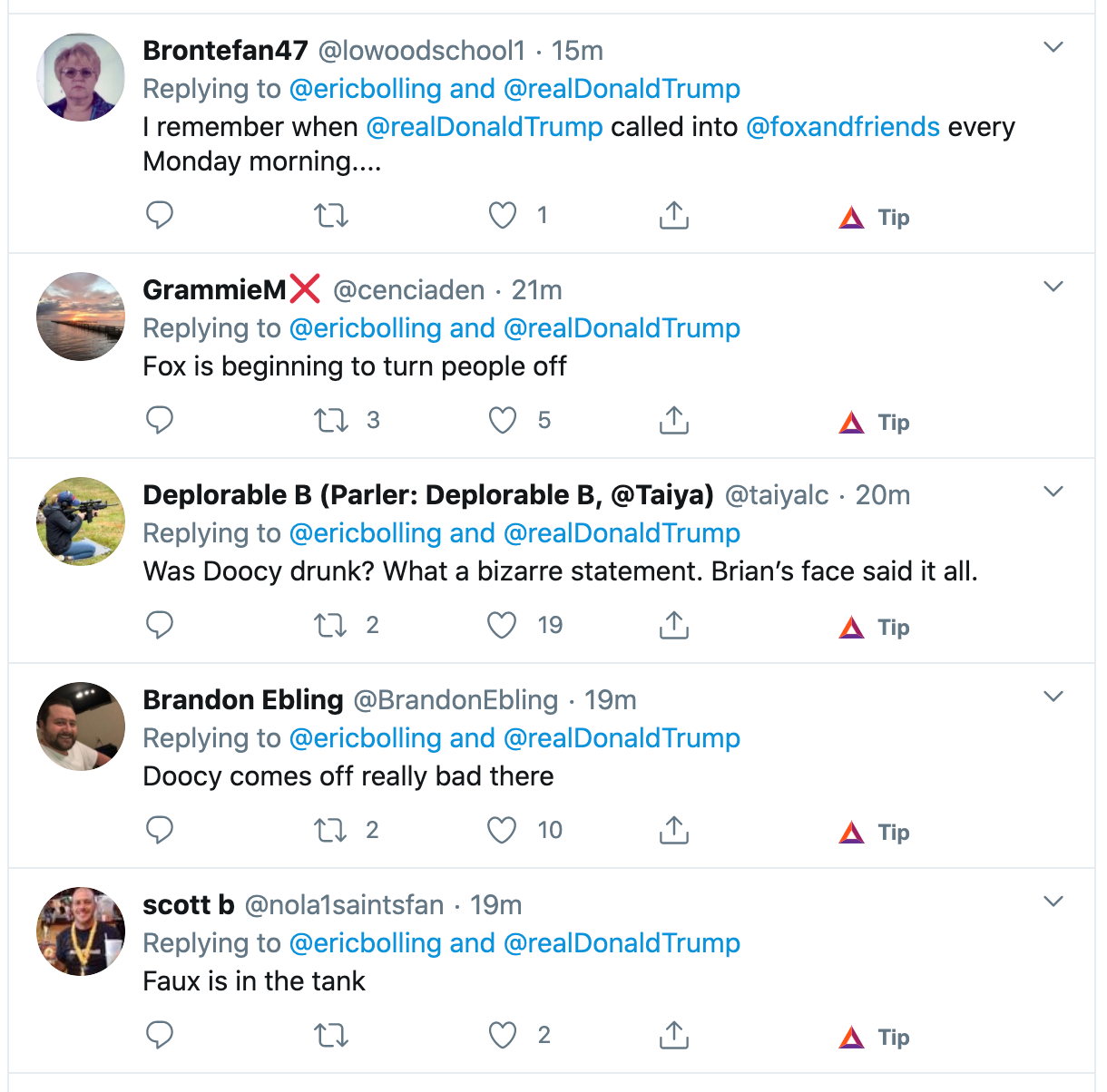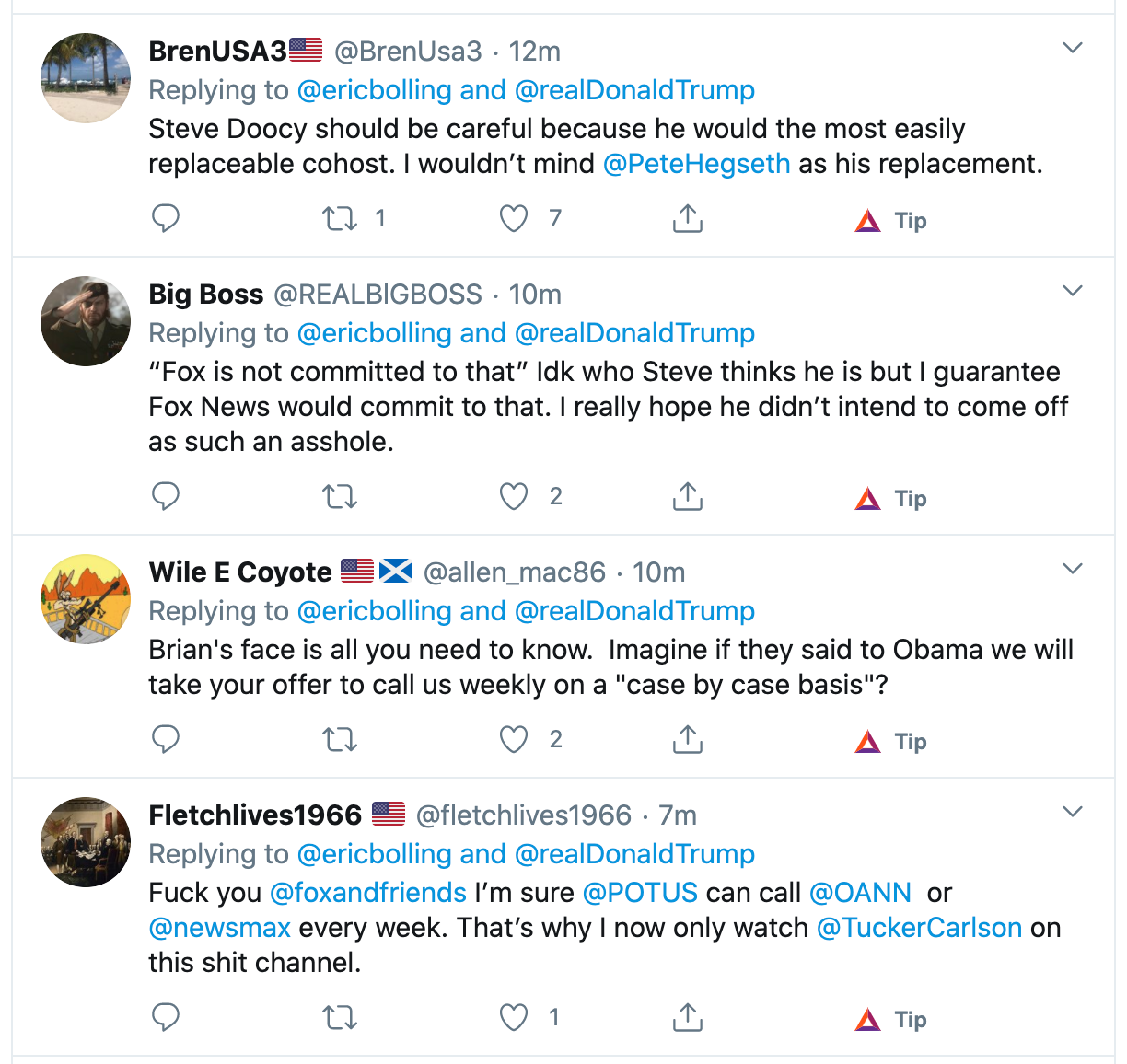 Fox News host Eric Bolling posted the clip of Doocy’s weird comment, and we see in the comments that the Fox News viewership is not happy.