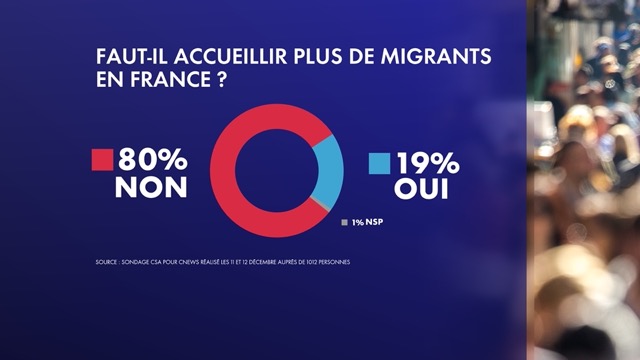 According to the survey conducted by the CSA Institute for CNEWS published on Tuesday, 80 percent of people in France want a ban on immigration, compared with just 19 percent in favor of further new arrivals.