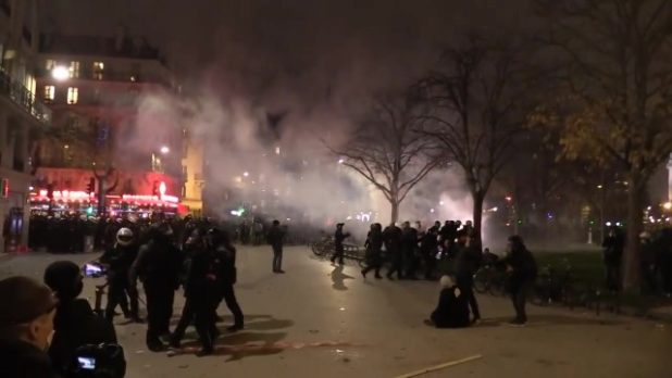 Footage from Paris shows protesters hurling objects at police, and riot-geared officers charging in response.