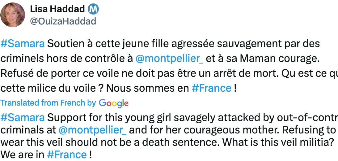 #Samara Soutien à cette jeune fille agressée sauvagement par des criminels hors de contrôle à @montpellier_ et à sa Maman courage. Refusé de porter ce voile ne doit pas être un arrêt de mort. Qu est ce que cette milice du voile ? Nous sommes en #France ! pic.twitter.com/dX8y2alCvF