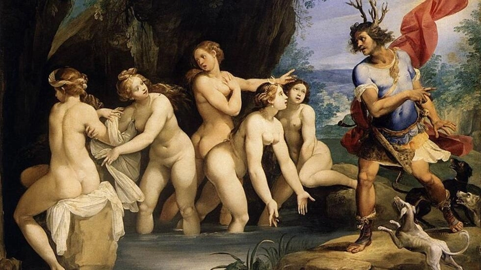 The painting, “Diana and Actaeon” by the Italian painter Giuseppe Cesari, portrays a Greek mythology story in which the hunter Actaeon bursts in at a site where the goddess Diana and her nymphs are bathing.