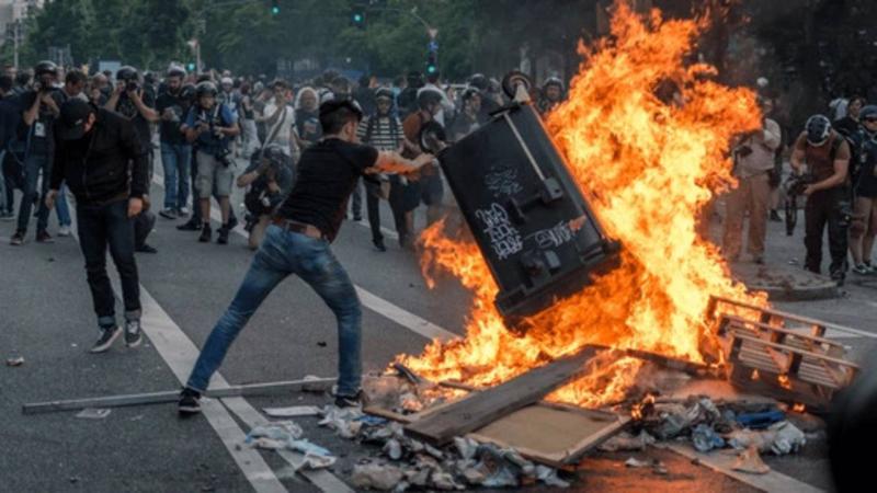 Stunning video spread widely online showed mass groups of demonstrators clashing with cops, launching fireworks that at times bathed city streets in an eerie blood-red glow.