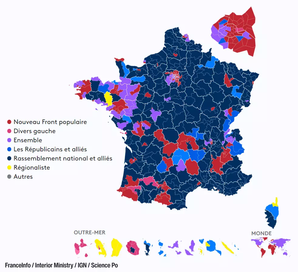 A united bloc of left-leaning parties called the New Popular Front coalition nabbed 28% of the vote for a second-place finish, while incumbent President Emmanuel Macron’s centrist party scraped together just 20% of the vote.